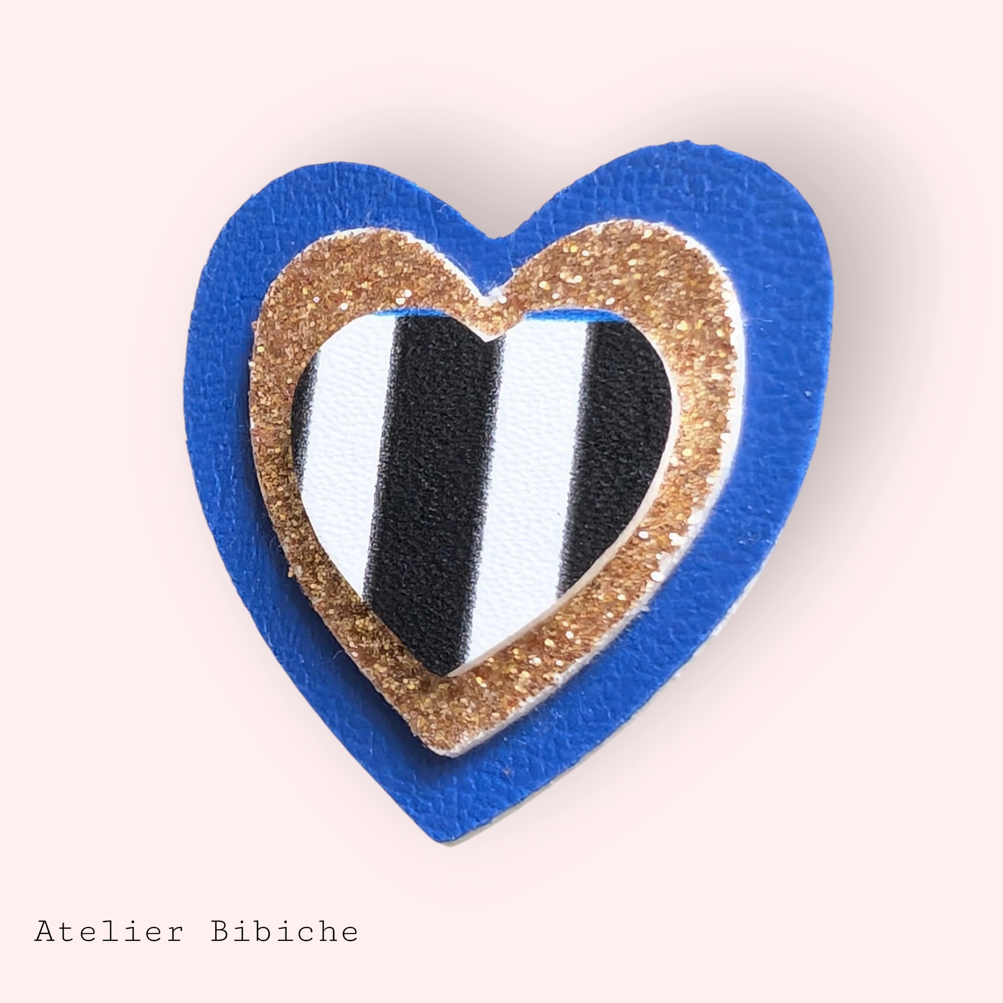Affichez un look graphique et glamour avec notre Broche Cœur "Rayures Cobalt Glam".